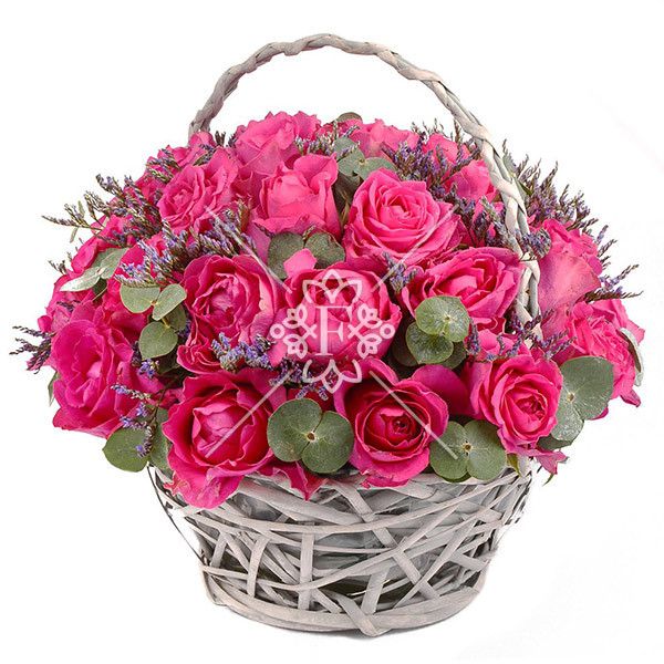 Корзина малиновых роз "Танец любви", с нежно-лавандовым лимониумом и эвкалиптом, выглядит восхитительно! Насыщенный оттенок роз, нежная зелень эвкалипта и прекрасное оформление, создают гармоничный и привлекающий взгляд ансамбль!
