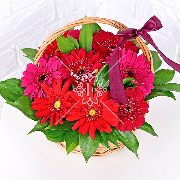 Обратите свое внимание на чудесную плетеную корзинку, в которой расположились чудесные алые и малиновые герберы, окруженные нежной декоративной зеленью! Эти цветы дарят в знак любви, уважения, восторга, с наилучшими и искренними пожеланиями!