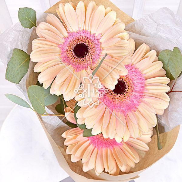 Очаровательные герберы  кремово-розового  оттенка с зеленью эвкалипта выглядят заманчиво, гармонично и нежно.
